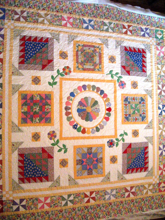 Linda T. created this fabulous Aunt Grace quilt. Pieced from 1930’s fabrics, this intricate design captures the simple beauty of precision piecework. We chose simple quilting designs to compliment quilting of that era. Click on the pictures below to view the closeups