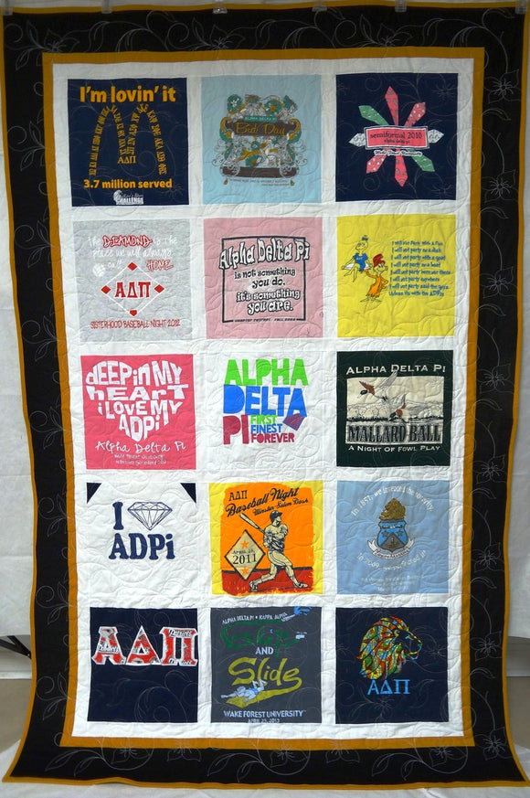 Andrea preserved her favorite t-shirts in this Classic Gold, Black and White designed T-shirt quilt. The white thread blended with her shirts but made a beautiful contrast on the quilt back. The Flower and Vine pattern is an elegant quilt pattern.