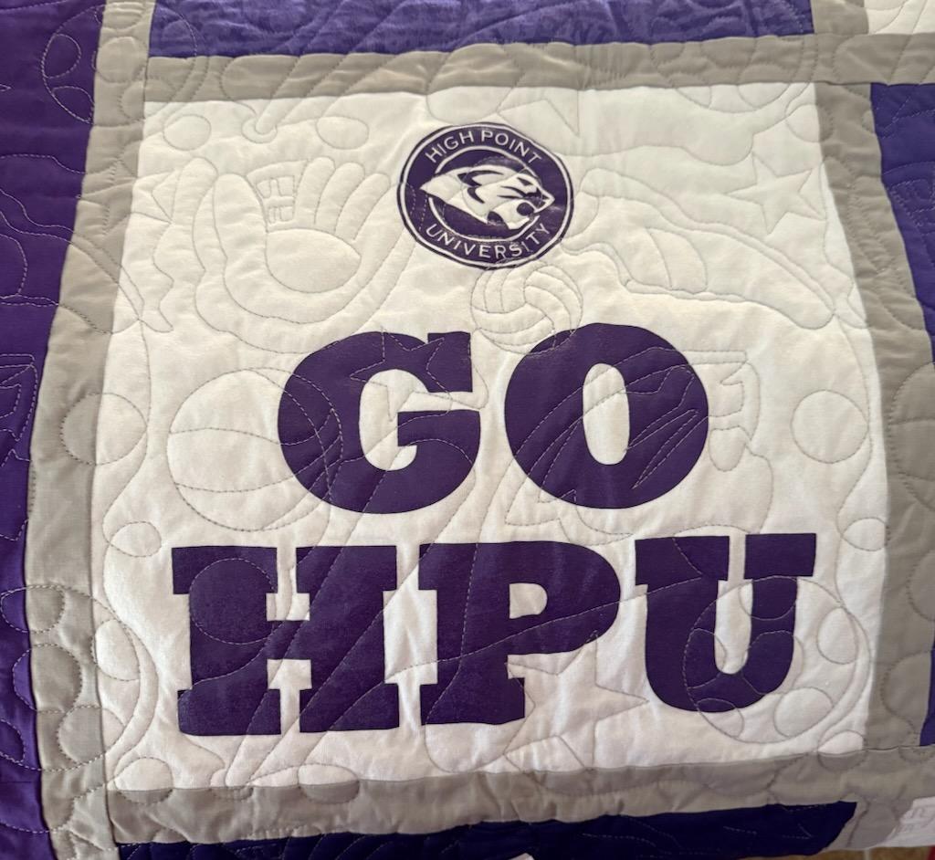High Point University memories preserved from multiple generations! Such a treasury of heritage compiled in one memory quilt! It's very special! We added an extra special touch to this quilt. Caleb is a runner and enjoys multiple sports. So we created a unique stitching pattern that includes panthers, tennis shoes, basketballs, volleyballs and baseballs with bats intermingled with stars. Combine this with the primary purple and white colors of the shirts and you have an heirloom quilt with memories created from student, parent and grandparents t-shirts. Now that's a family collaboration! Do you have an idea for collaborating with your family to create some special memories?Â