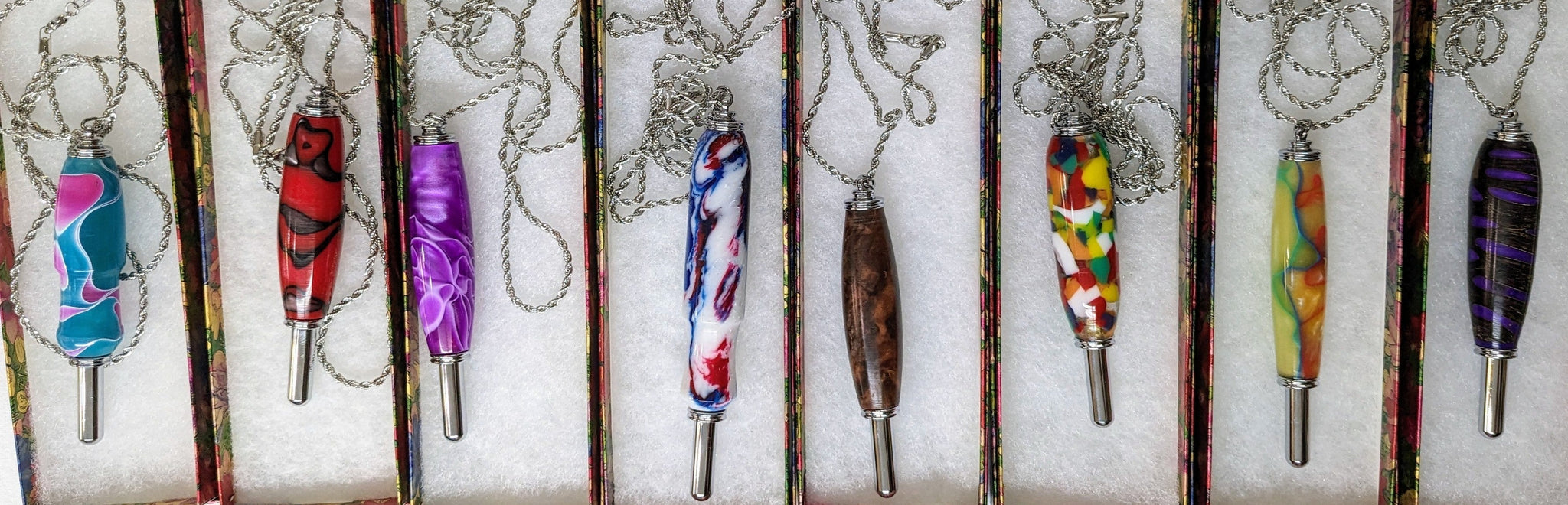 Sew Fabulous Bob has handcrafted these beautiful Hand-turned Seam Ripper Necklace. Each seam ripper detaches from the necklace and is housed in a sleeve inside the turned center. The seam ripper is attached to the chain with a magnetic clasp. Just pull the seam ripper to remove it from the necklace, pull the metal tool from the insert and flip it around. Push the metal seam ripper smooth end back into the housing and use the tool as needed.