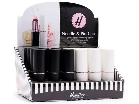 Store your needles and pins in style. Lipstick case with pin cushion. With 5 hand needles. Simply turn and open like a normal lipstick. Colors: Black, White