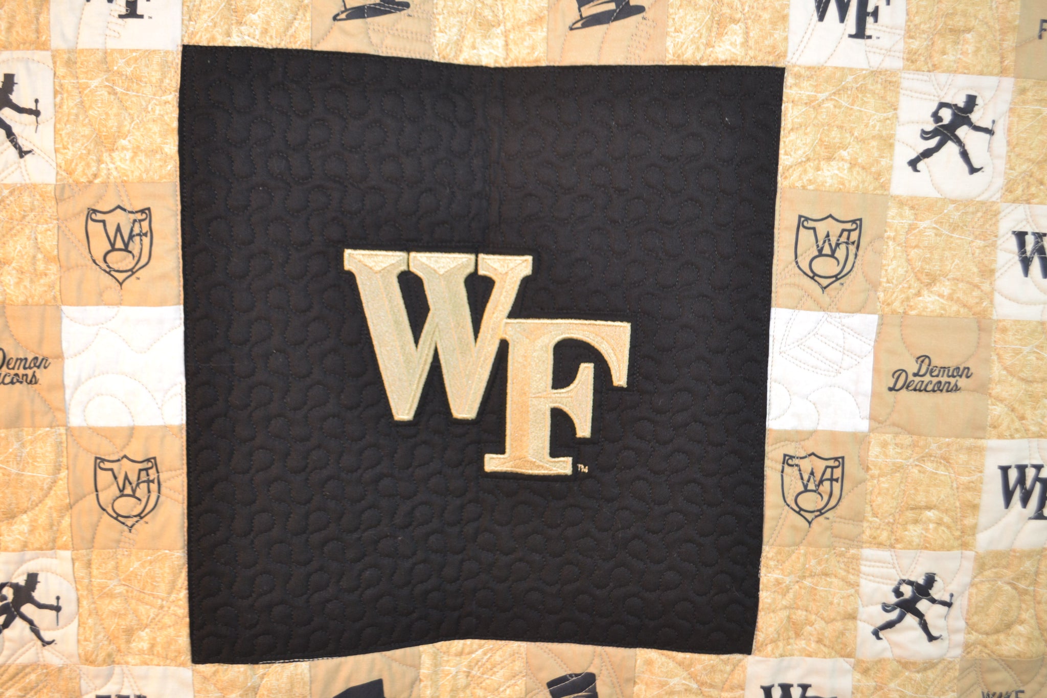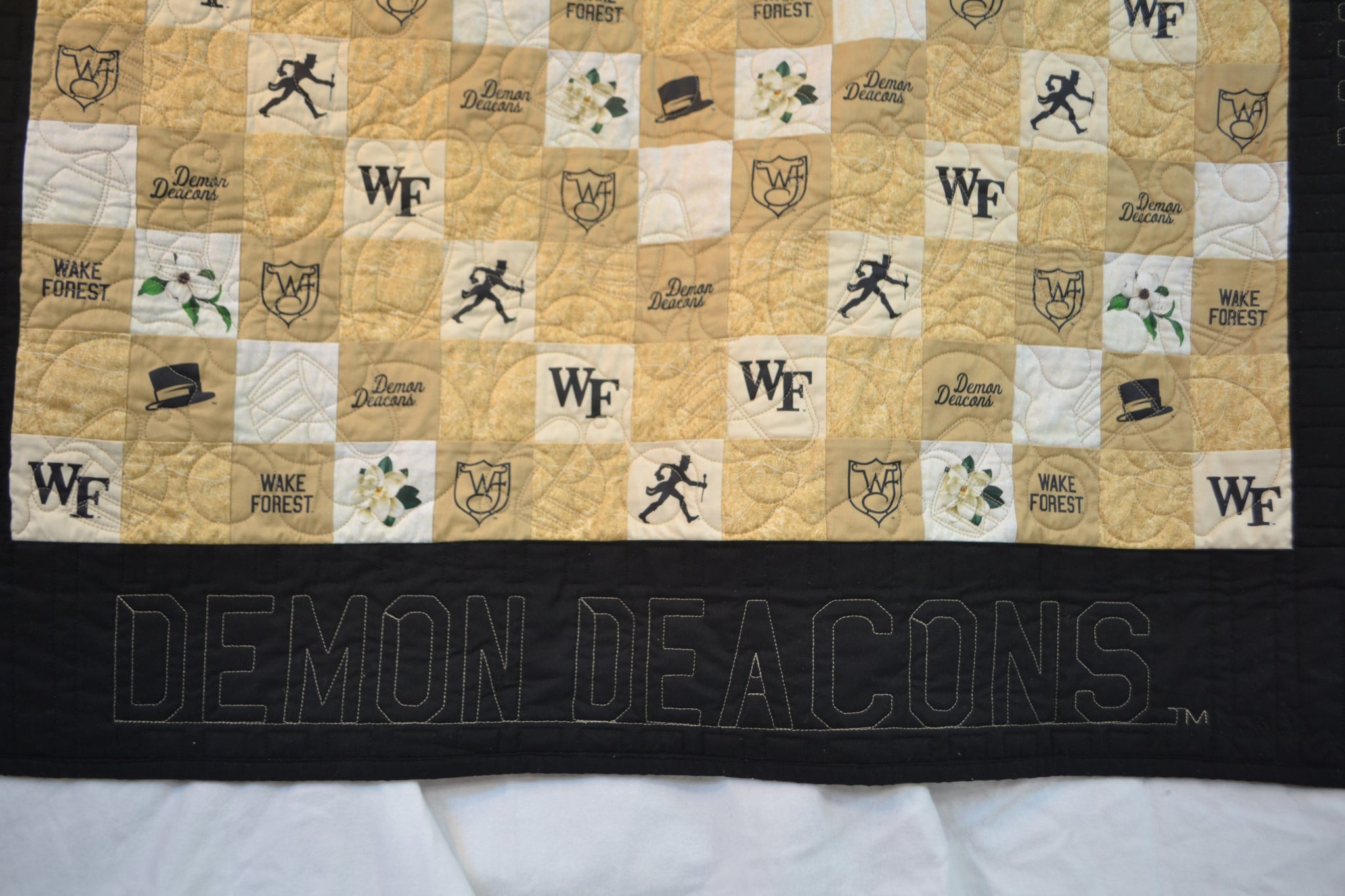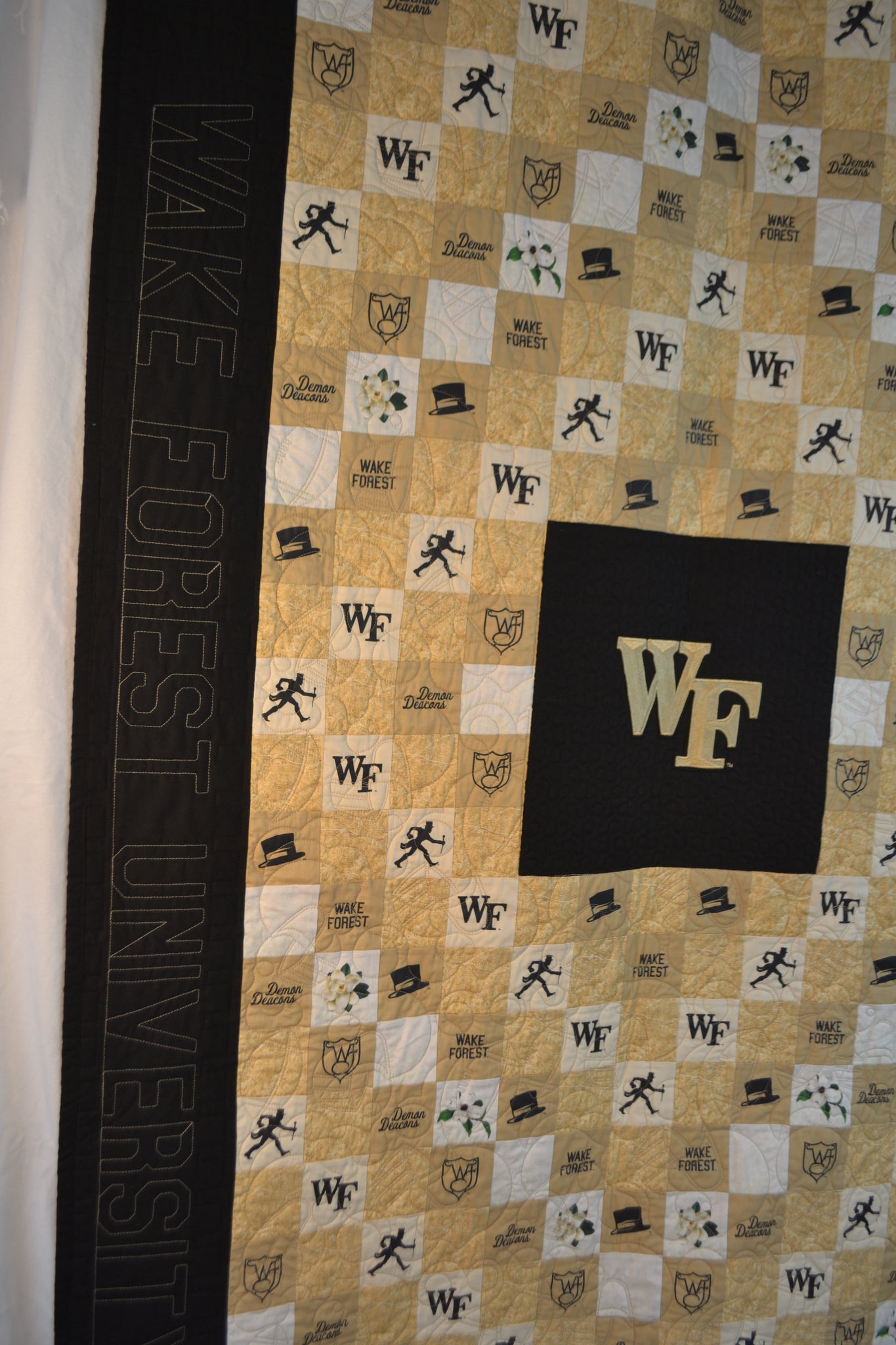 Have you noticed the details we have included in the "Dreamin' Deacon II" quilt design? The mottled squares are a replica of the topological map of Winston-Salem! Zoom in and you can see the street map. We included the Wake Forest logos in the squares including the Strutting Deacon, WF, Top Hat, Ironwork WF, and words Wake Forest and Demon Deacon. Also included are the magnolia and dogwood blooms so endeared by our beloved campus. The borders are stitched with Wake Forest University and Demon Deacons.