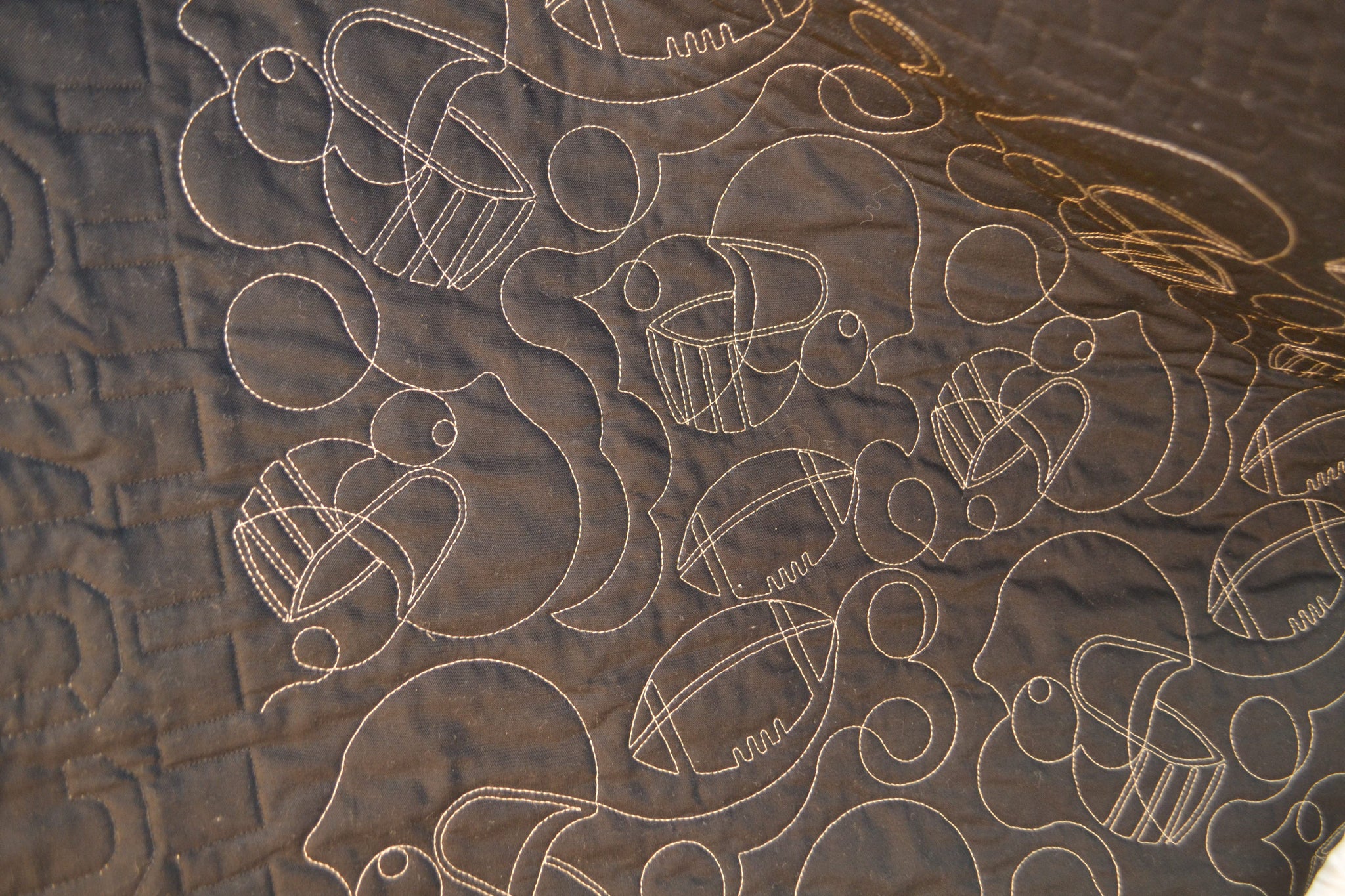 SOLD OUT of Dreamin' Deacon II Personalized and Customized Quilt. If you would like, I have one Dreamin' Deacon quilt stitched in footballs and helmets ready to ship. If you would like us to personalize it, we can embroider a label for the back corner of the quilt.