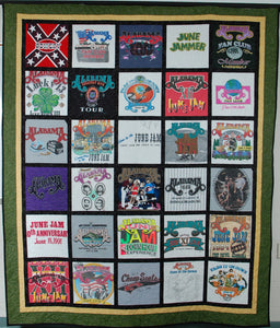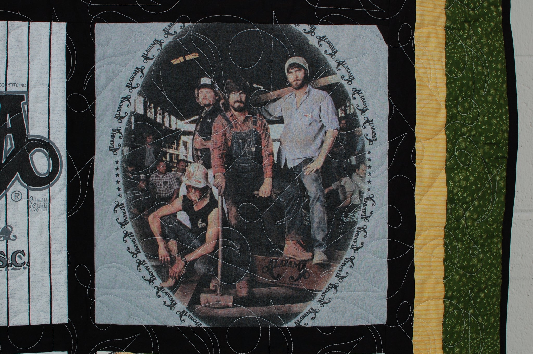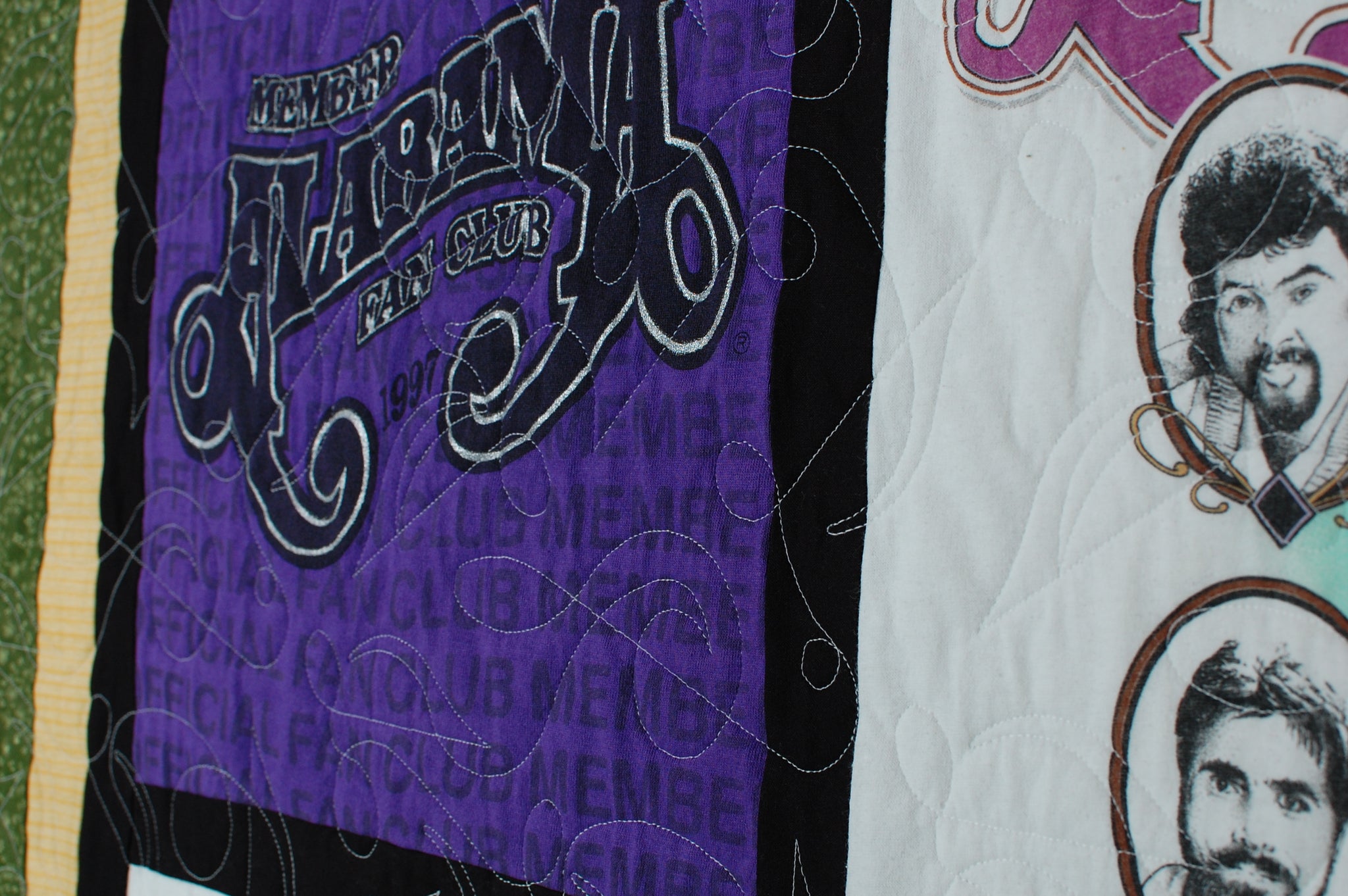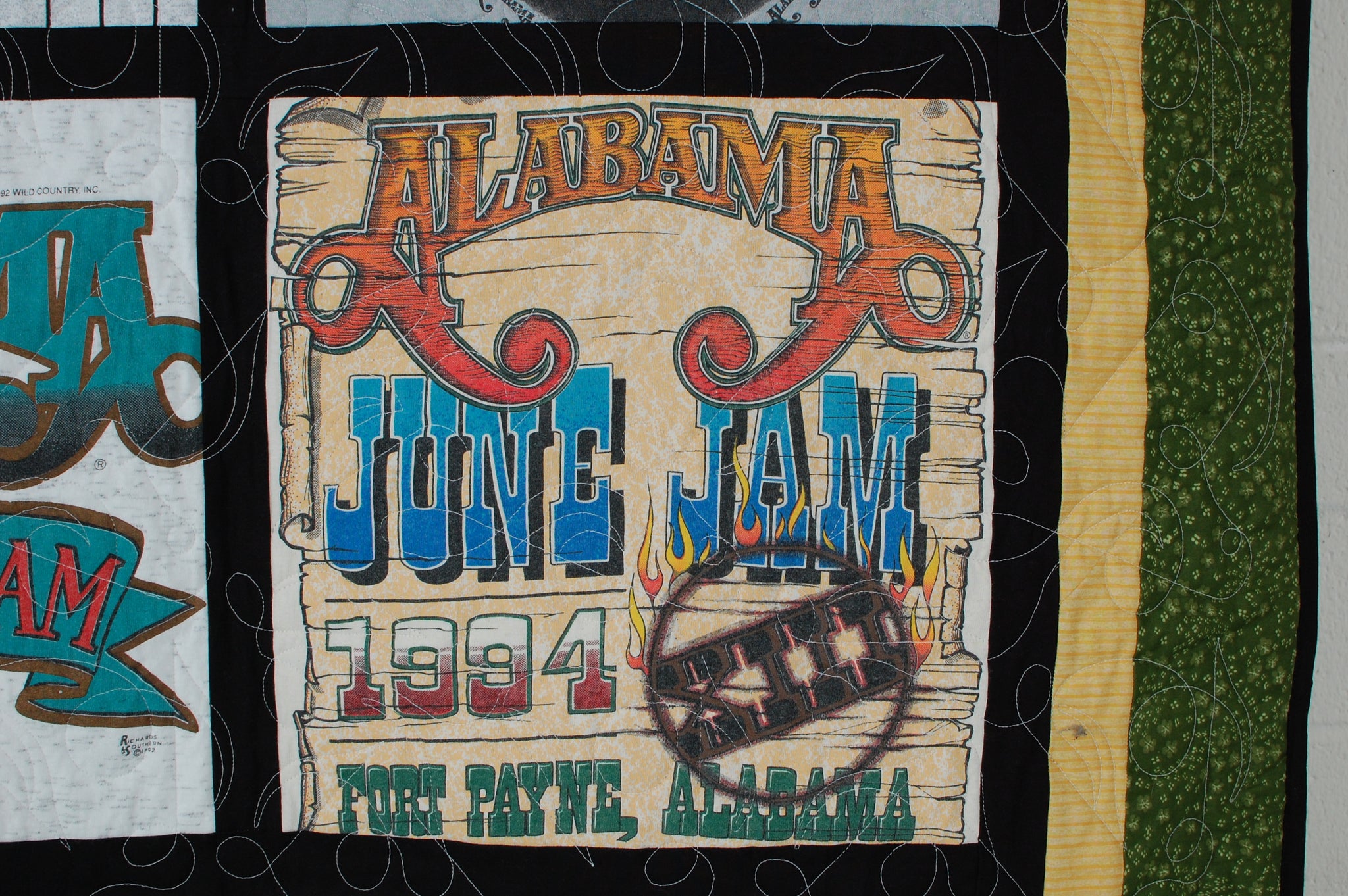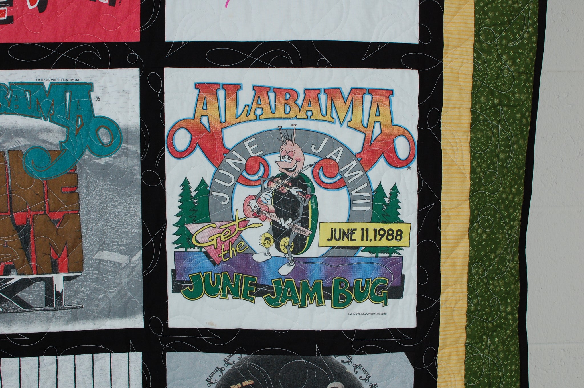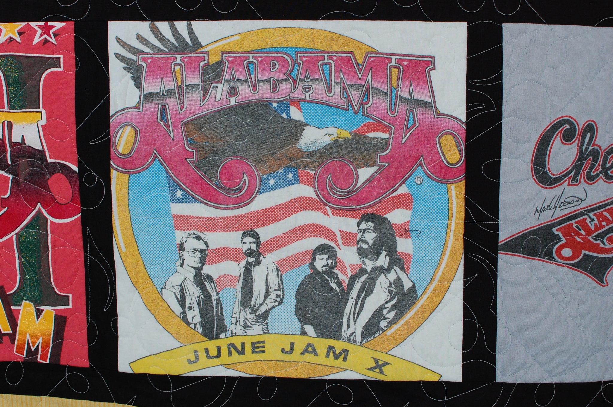 T-shirts saved from 25 years of Alabama concerts. Preserve your special t-shirt memories with a custom theme-stitched design. Music notes and symbols were stitched in this quilt to make a special tie to the Alabama concerts.