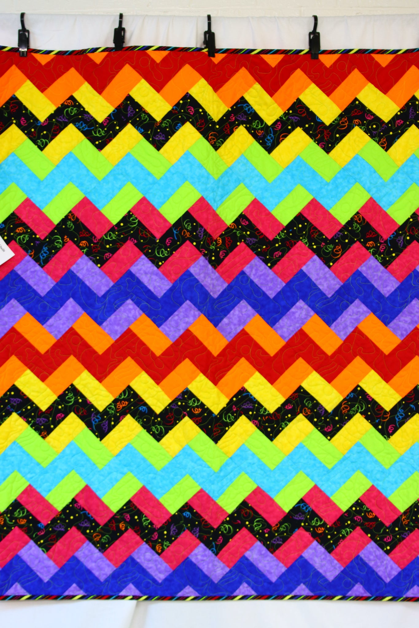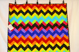 Bright modern twist of colors in a chevron design. quilted with lime green thread in a guitars stitching pattern.