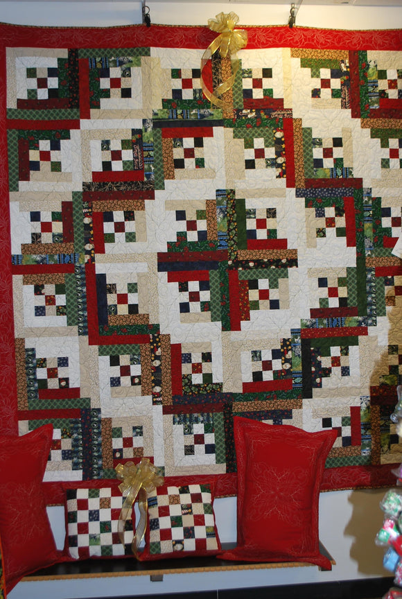 Christmas Yuletide is a Queen Quilt Set which includes a 94″ x 94″ 9-patch log cabin quilt, 2 custom quilted pillow shams in a holly theme and 2 – 17″ patchwork pillows all quilted in a holly theme. This gorgeous quilt has a 12-15″ drape on a queen size bed. The red and green fabrics of the log cabin make a marked contrast to the light fabrics of the lob cabin design. The 9-patch centers make for an unusual pattern of this log cabin design. The solid red border framing the quilt is stitched in holly which makes an excellent accent to the quilt.