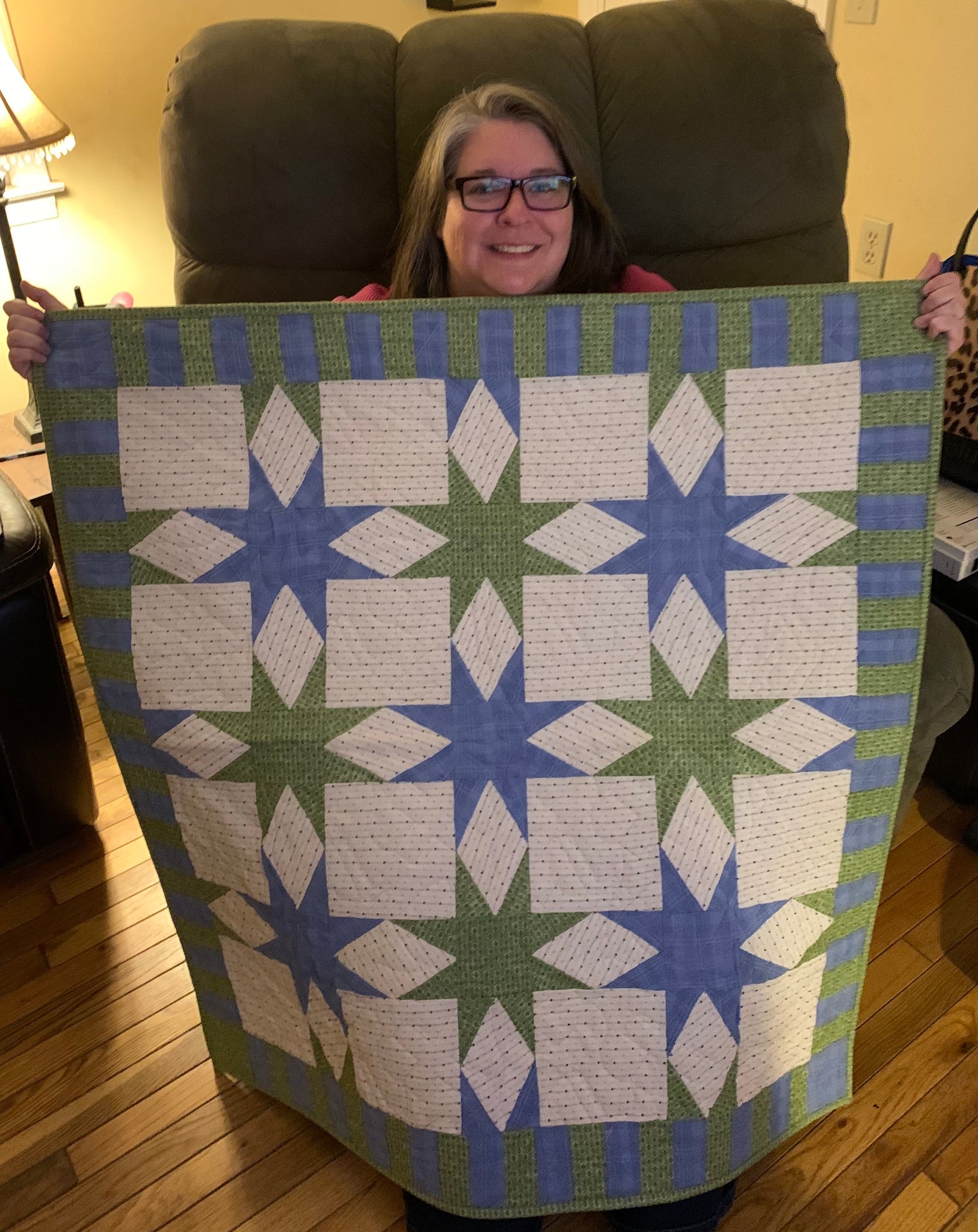 A friend's father passed recently and she struggles with missing him and spending time with him. So her brother came up with the idea of sharing a part of their father's memory with her. He brought me 2 of their father's favorite shirts and said, "Can you create something small, just something to cover her lap? Her favorite color is green."