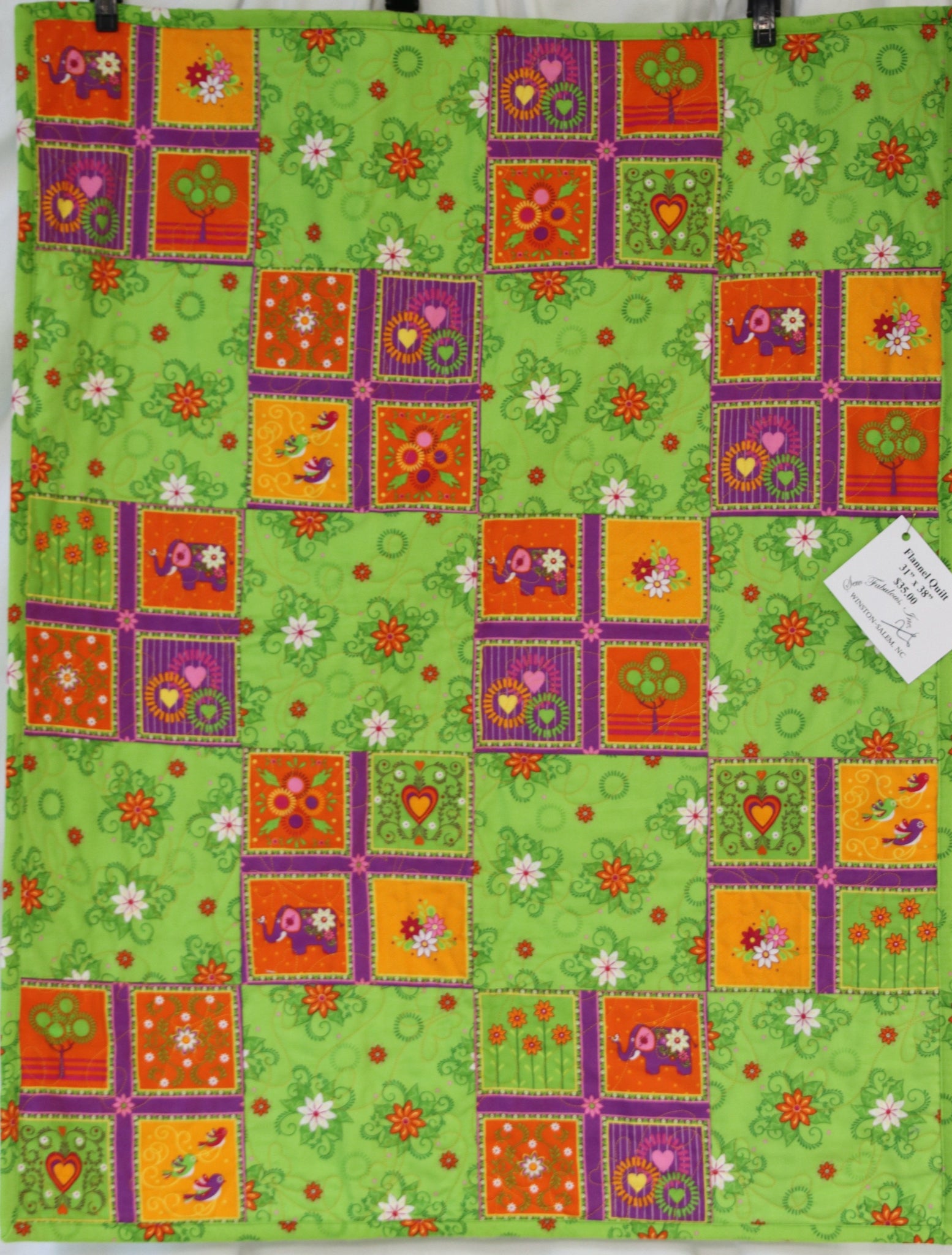 Cutie Patootie Flannel Baby Quilt has a soft flannel top and flannel back with a flannel insert. Soft and warm quilt the perfect size for a baby. Quilt measures 31" wide and 38" long. Quilting is in flutterbys (a mixture of dragonfly and butterfly).