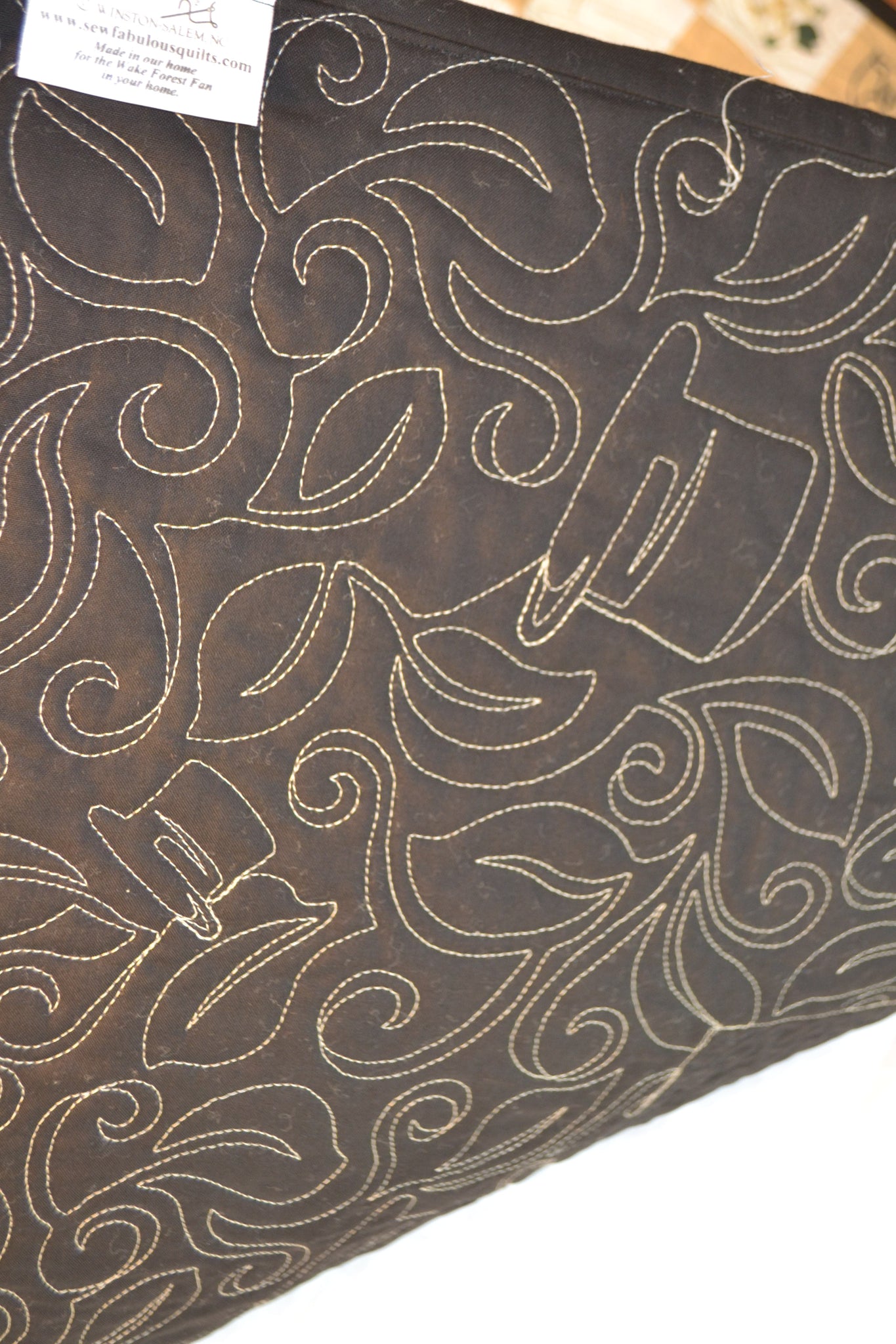 Have you noticed the details we have included in the "Dreamin' Deacon II" quilt design? The mottled squares are a replica of the topological map of Winston-Salem! Zoom in and you can see the street map. We included the Wake Forest logos in the squares including the Strutting Deacon, WF, Top Hat, Ironwork WF, and words Wake Forest and Demon Deacon. Also included are the magnolia and dogwood blooms so endeared by our beloved campus. The black binding adds a framed edge to the wallhanging.