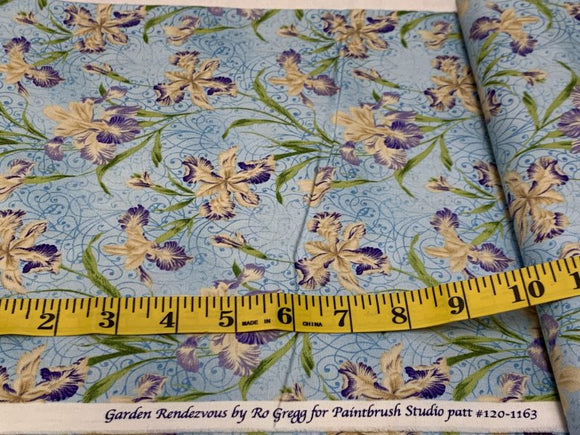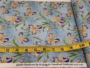Garden Rendezvous–Purple and Yellow Iris on Blue 19