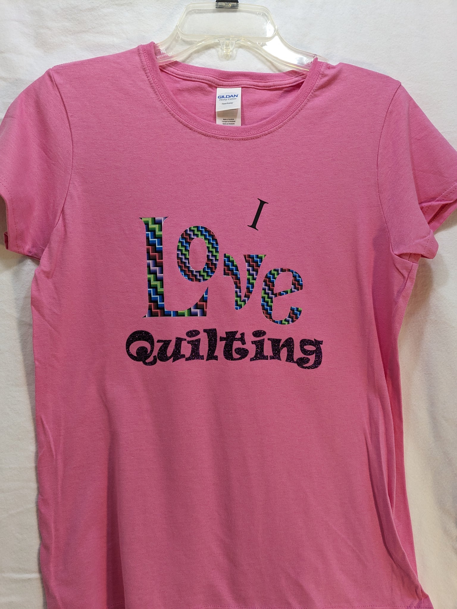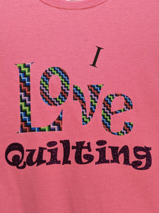 Quilt Themed T-Shirt - I Love Quilting - Pink Crew Neck #6009