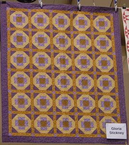 Designed with the gold and purple of royalty, the quilting design of the blocks is a crown. The center of the blocks and the sashing centers are quilted in a daisy design.