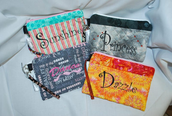 Each purse measures approximately 5" x 7". The purse is quilted with a thick double layer of batting and embroidered with the word of your choice. A keychain rhinestone wristlet completes the assembly adding the perfect touch of bling.