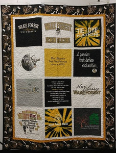 I collected t-shirts from campus and created this t-shirt quilt. It is sashed in a gold and black checkerboard pattern and quilted with a scholar design. Great combination for a Wake Forest Graduate!
