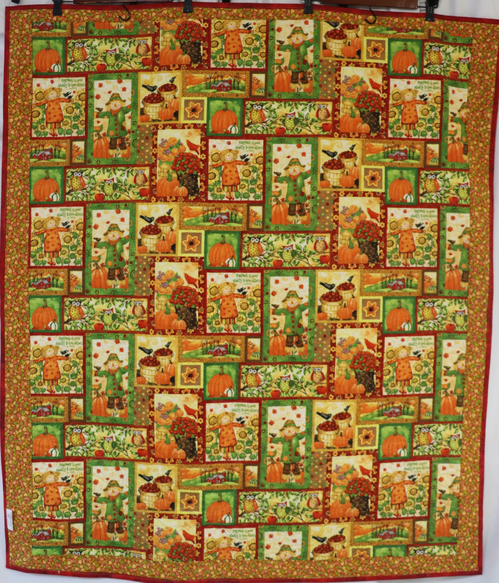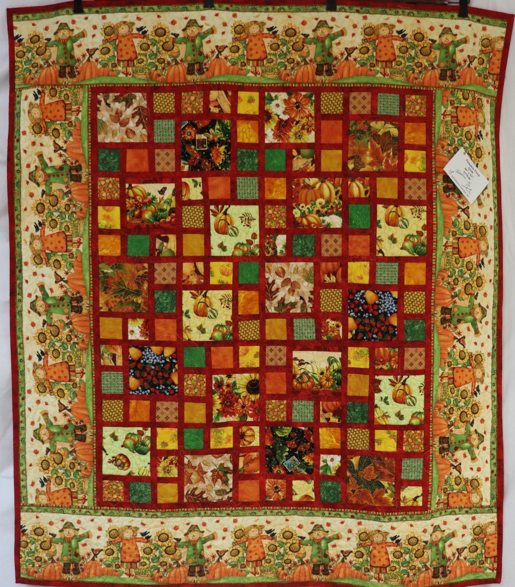 Scarecrow Charm Patch Quilt is constructed with a variety of autumn themed fabrics sashed with a warm red color. Border of scarecrows and pumpkins makes for a delightful scene. Stitching pattern is in pumpkins. Quilt backing fabric displays a variety of autumn scenes.