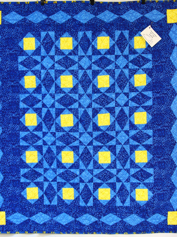 Storm at Sea Quilt in blue is a collection of squares, redtangels and diamonds which creates an illusion of waves in a storm. The intricately pieced design is a favorite among advanced quilters. The quilting is concentric circles which lends to the illusion of movement in the waves.